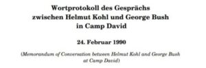 Englischsprachiges Original:https://nsarchive.gwu.edu/sites/default/files/documents/4325690/Document-13-Memorandum-of-Conversation-between.pdfÜbersetzung des folgenden Dokuments:National Security Archive,The George Washington University, Washington, D.C.,https://nsarchive.gwu.edu/sites/default/files/documents/4325690/Document-13-Memorandum-of-Conversation-between.pdfWortprotokoll des Gesprächszwischen Helmut Kohl und George Bushin Camp David Hier geht’s zum Dokument: