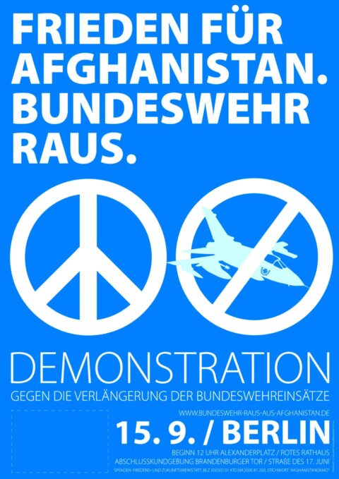 Aufruf zur bundesweiten Afghanistan-Demo am 15. September Frieden für Afghanistan –Keine Verlängerung der Bundeswehreinsätze! „… dann gibt es nur eins: Sag NEIN!“ (Wolfgang Borchert, 1947) Im September und Oktober steht die … Weiterlesen