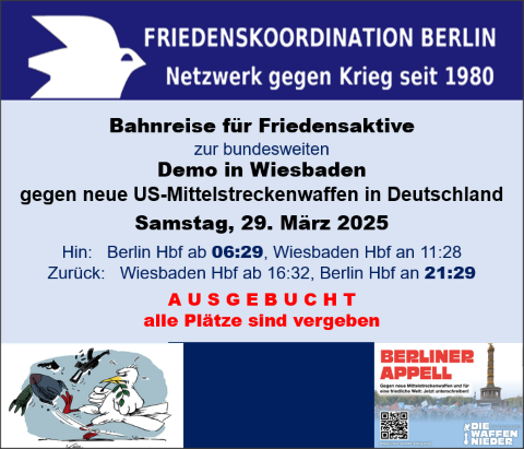 Am 29. März findet eine bundesweite Demonstration in Wiesbaden statt unter dem Motto„Keine neuen US-Mittelstreckenwaffen in Wiesbaden – für das Friedensgebot der Hessischen Verfassung“ Weitere Infos: https://frieden-und-zukunft.de/2025-03-29-demo-wiesbaden In Wiesbaden soll die … Weiterlesen