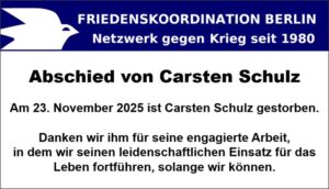 - Abschied von Carsten SchulzAm 23. November 2025 ist Carsten Schulz gestorben. Seit der Gründung des Bezirksverbands Tempelhof-Schöneberg der PDS, später die LINKE, leitete Carsten als Sprecher den Verband. Mit bewundernswerter Konsequenz und hartnäckiger Geduld gelang es ihm, trotz vieler gesellschaftspolitischer und innerparteilicher … Weiterlesen