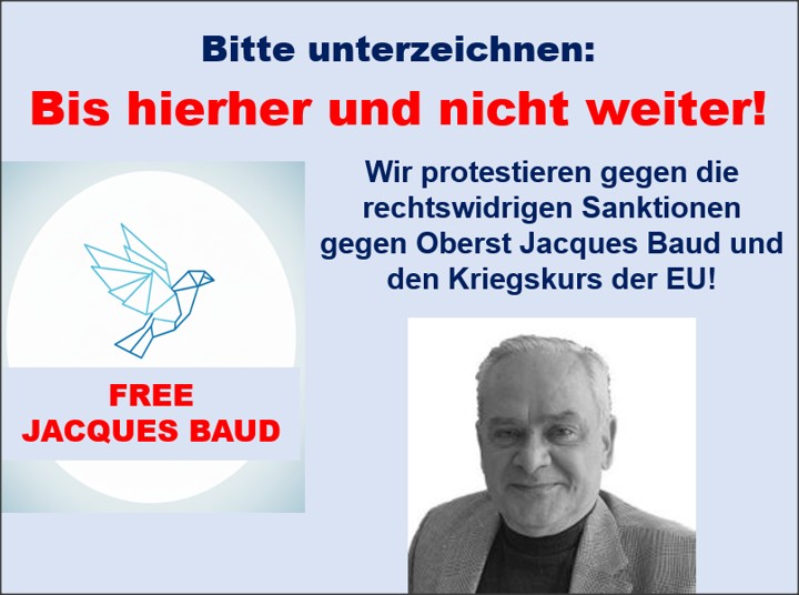 Bis hierher und nicht weiter!Wir protestieren gegen die rechtswidrigen Sanktionen gegen Oberst Jacques Baud und den Kriegskurs der EU!Bitte den Aufruf unterzeichnen:Free Jacques Baud! Mit ihrem jüngsten Sanktionspaket hat die … Weiterlesen