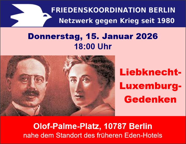 Liebknecht-Luxemburg-Gedenken 2026 15.11.2025 von Michael Lang Donnerstag, 15. Januar 2026, 18:00 UhrOlof-Palme-Platz, 10787 Berlin(nahe dem Standort des früheren Eden-Hotels)