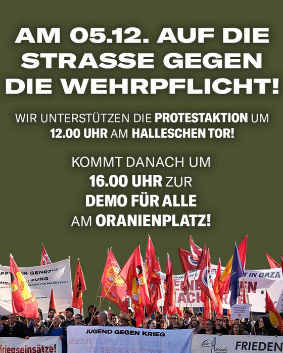 3. um 8.30 eine Kundgebung vor dem Bundestag, da dort über das neue „Wehrdienstmodernisierungsgesetz“ beraten und abgestimmt wird.